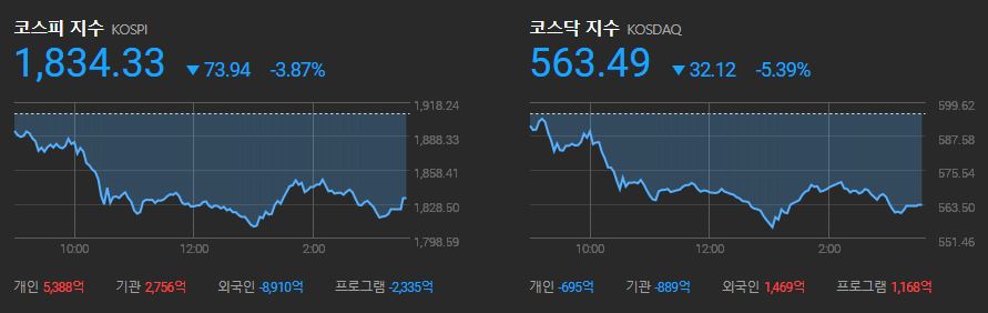 또다시 코스피가 5%대 급락하며 side car가 발동이 되었습니다.