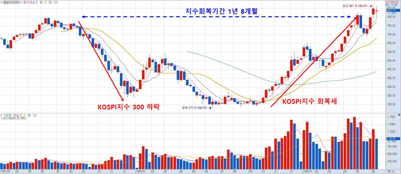 먼저 97년 IMF사태때의 KOSPI 주봉 그래프입니다.