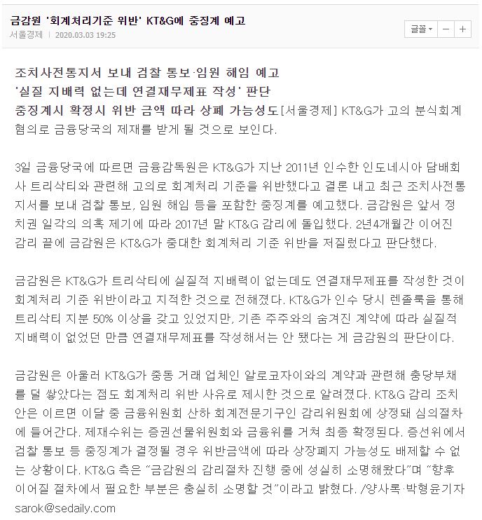 | [증권] KT&G 분식회계 혐의 / 해외법인 회계처리 / 033780 (0) | 2020.03.03 |